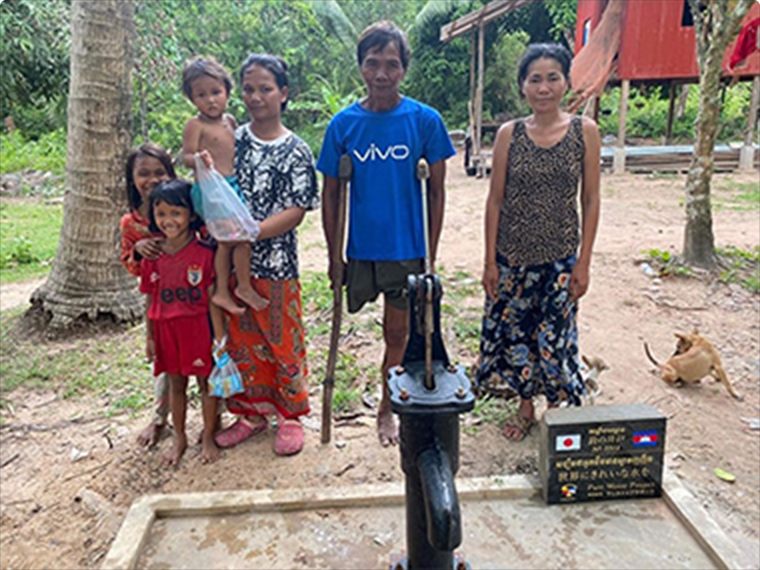 3人のお子様がいるヨンさん一家と、持病を抱えるご夫婦と高齢のおばあさまがいるワットさん一家の2家族、計8名の方々に使用いただく井戸。井戸には、クメール語で「皆様の健康をお祈りします」、日本語で「世界にきれいな水を」と希望を込めたプレートを付けました。